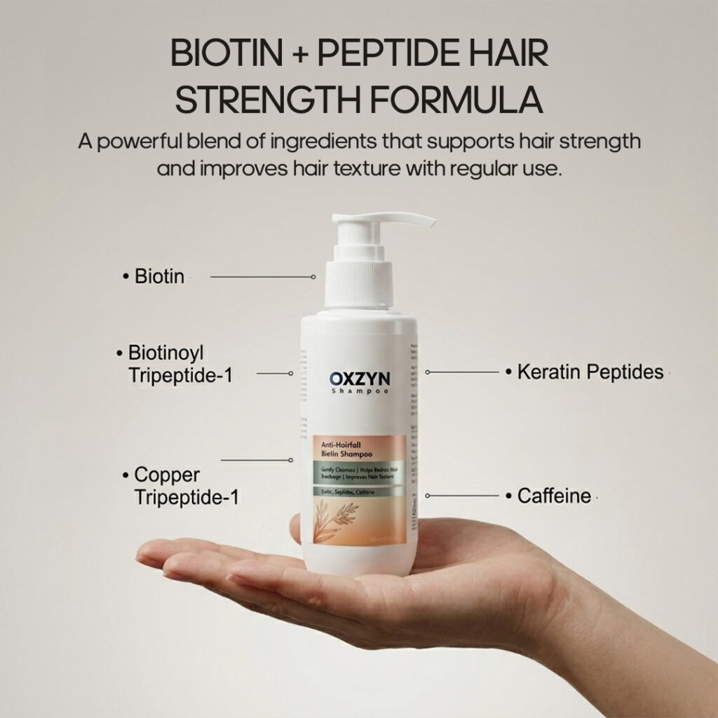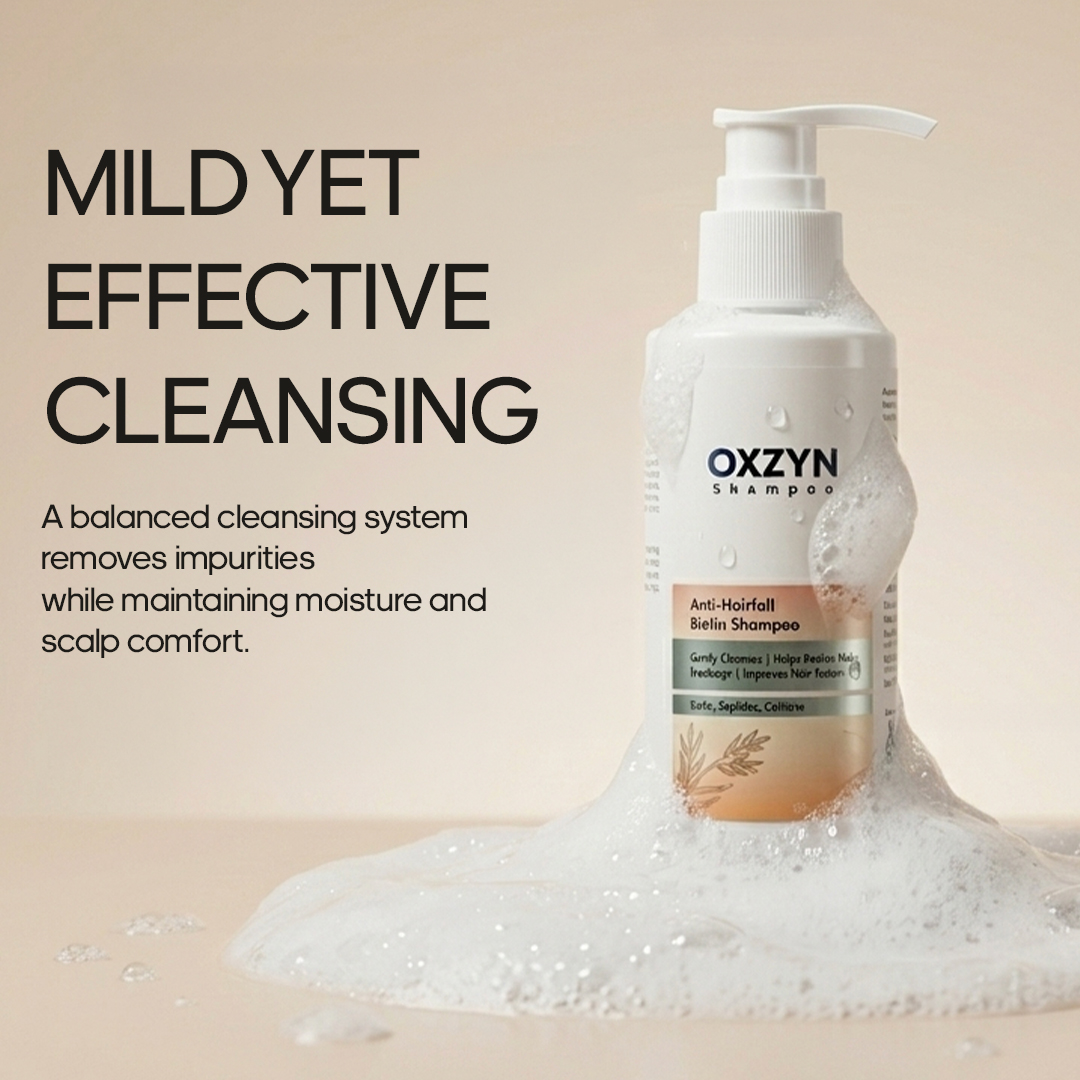 OXZYN Anti-Hairfall Biotin Shampoo is a scientifically formulated cleansing solution designed to support stronger, healthier-looking hair. Enriched with Biotin, advanced peptide complexes, and caffeine, this formula helps reinforce hair fibers while maintaining scalp balance.