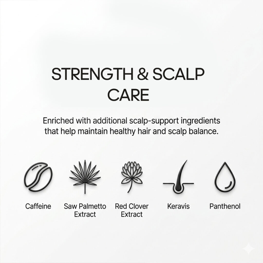 Powered by a multi-active complex including Redensyl, Procapil, Capixyl, Anagain, Capilia Longa, and Baicapil, the formula helps support the hair growth cycle and strengthen hair roots. Added Caffeine and Saw Palmetto Extract help maintain scalp vitality, while conditioning agents like Keravis and Panthenol support hair strength and smoothness.